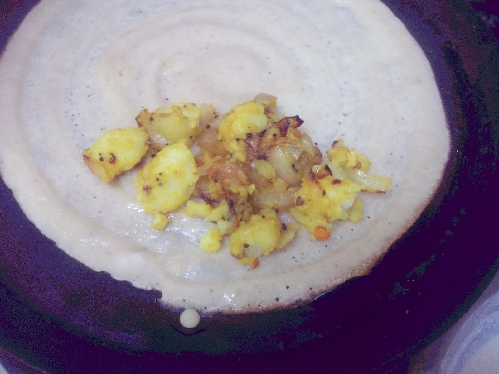 Heat pan, clean tawa with little bit oil and then wipe it nicely with tissue paper. Pour ladle full of batter. Keep the flame high. Put oil all around and let it get crispy and golden When it start getting brown from edges, keep aloo masala or any other masala of your choice.