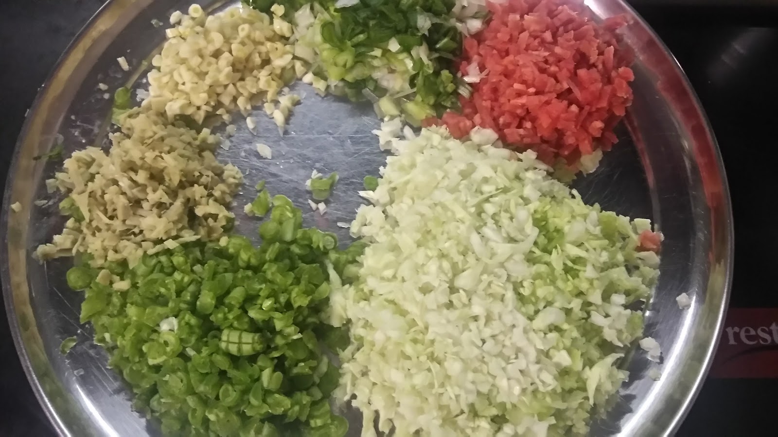 1. Take wok or pan, heat oil, add finely chopped ginger-garlic. Saute till fragrant don't turn it brown, add chopped beans saute on high flame, add spring onion saute, add carrot, saute. Add cabbage and saute on high flame.
